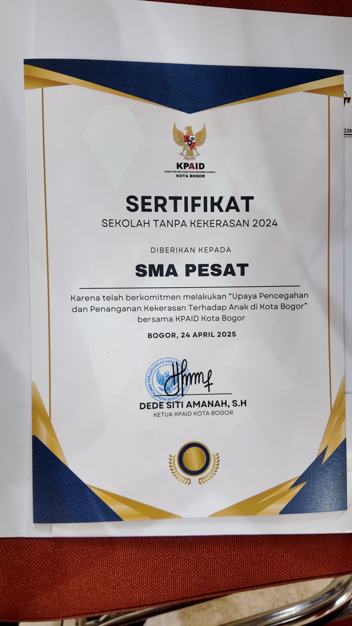 Kamis, 24 April 2025 — Suasana haru dan bangga menyelimuti keluarga besar SMA Pesat School of Talent saat menerima Sertifikat Penghargaan “Sekolah Tanpa Kekerasan” dari Komisi Perlindungan Anak Indonesia Daerah (KPAID) Kota Bogor. Acara penghargaan berlangsung di Paseban Sribaduga, Balaikota Bogor, dan menjadi bukti nyata komitmen SMA Pesat dalam menciptakan lingkungan belajar yang aman dan ramah anak.